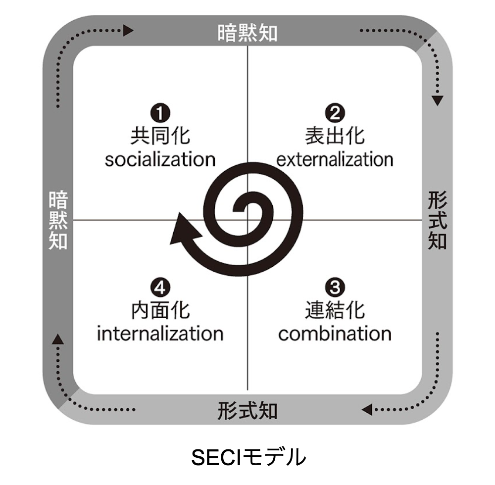 話題はAIをはじめとするテクノロジーとアジャイルの交差点へと移っていきます。平鍋さんは、アジャイルが「変更・適応・学習」を価値とするならば、AIもまた「人・チーム・組織がどう学び、どう意思決定し、どう役割を変えるか」という問いを投げかける技術であると語ります。また、野中郁次郎さんが体系化したSECIモデル(下図を参照)を用いて、暗黙知と形式知の循環において、AIは表出化や連結化が得意で人は太刀打ちできないので、AIのスピードを活かしつつ、人間は暗黙知を生み出す領域で価値を発揮して全体としてアジリティを生み出すべきだと主張しました。JJは補足するように、アメリカの変革組織では「技術革新(特にAI)を“既存業務の部分最適化ツール”ではなく、“組織のOSを再設計するきっかけ”として活用する」という動きが広がっていることを紹介しました。